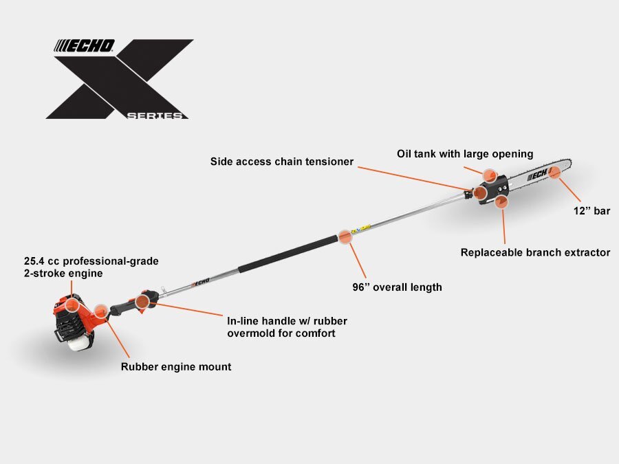 The PPF-2620 Power Pruner® pole saw with a 96 in. fixed shaft combines lightweight design, user-friendly ergonomics, and the power you expect from ECHO. Features like two-stage air filtration and a side-access chain tensioner simplify in-field maintenance. |