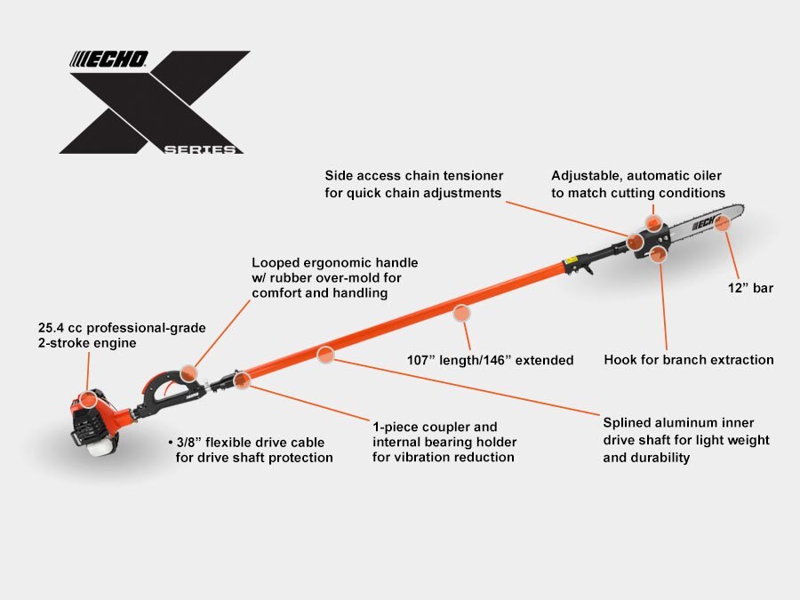 THE POWER AND REACH TO MEET THE TALLEST TASKS25.4 cc professional-grade, 2-stroke engine For outstanding performance and durability Large 20.6 fl. oz. fuel tank Extends run time between fill-ups Tool-less access air filtration system For easy and convenient in-field servicing Automatic, adjustable oiler Matches the cutting conditions for reduced oil consumption Bellows-style fuel transfer system Provides for easy start-ability especially for re-starts in hot, dusty climates Rubber rear hand grip with loop-style handle Delivers extreme user comfort Ribbed fiberglass outer shaft Provides rigidity and control Two-stage air filtration system Dramatically increases cleaning capability and allows for longer maintenance intervals Magnesium gear case with side-access chain tensioner For durability and easy chain adjustments |