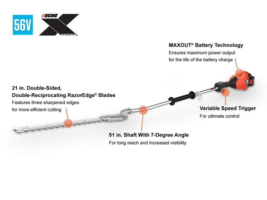 The ECHO DSHC-2600 Shafted Hedge Trimmer, built for pros, features MAXOUT® technology for consistent power. Its 21 in. RazorEdge® blades and 7° angle offer precise cuts, while the flanged front-grip and top-mounted motor provide gas-like performance. |