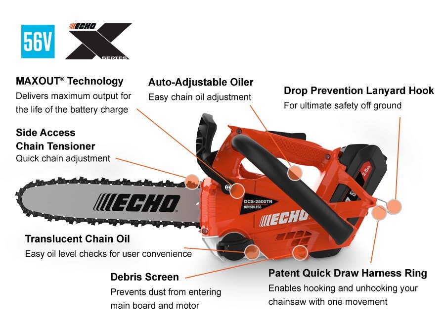 LIGHTWEIGHT POWER AND INCREASED EFFICIENCYBrushless motor For superior, gas-like power and performance MAXOUT® technology Ensures maximum power output for the life of the battery charge Patented quickdraw harness ring For easy attaching and detaching Easy-access, internal debris screen Prevents wood chips from entering motor and electronics Metal bumper spike Improves user control and leverage Available in 12 in. bar length For larger limbing applications Drop-prevention lanyard hook Increases operator safety in a tree or bucket Molded-in lanyard hook Provides a convenient location 80TXL cutting system Provides more efficient cutting and less vibration |