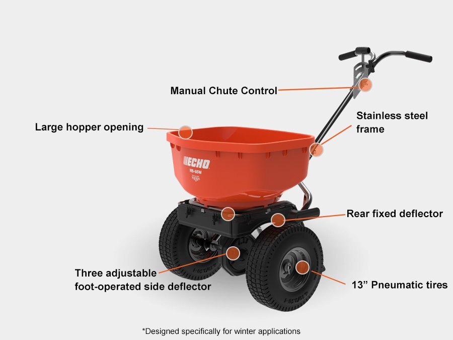 The ECHO RB-85W Broadcast Spreader is a winter model for spreading salt, featuring a stainless-steel frame, salt-specific hopper and agitator, along with a 4-sided deflector. It's purposely designed to provide maximum productivity utilizing high-quality and durable components. |