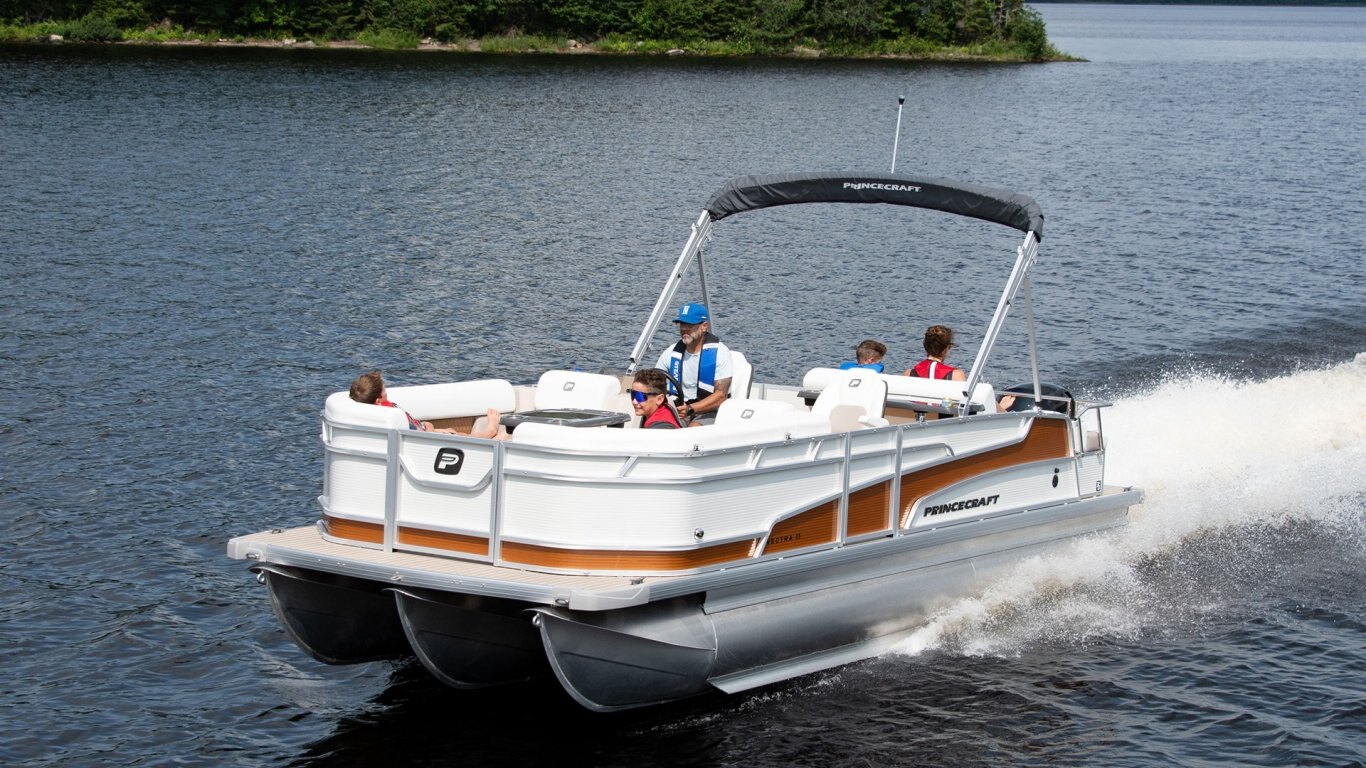 • Nautical Blue Edition including 3D Princecraft® black chrome logo on both sides and front door, Nautical blue exterior colour accent, deluxe driver seat (and if applicable passenger captain's chair and slider), LED lighting under driver console and furniture, superior steering wheel, docking lights and colour accent in the standard upholstery only